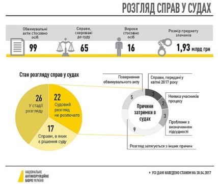 Как сообщает пресс-служба НАБУ, по состоянию на 30 апреля Бюро направило в суды 65 дел, из них суды приняли решения лишь в 17 делам, 26 дел находятся на стадии рассмотрения, а рассмотрение 22 не началось.