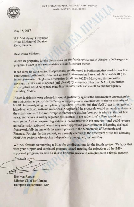 Как сообщает "Европейская правда", в ее распоряжении имеется копия письма за подписью Рона ван Роодена, руководителя миссии МВФ, поступившего в понедельник 15 мая.