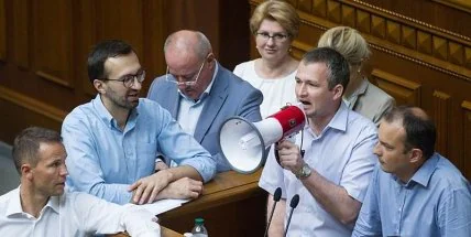 Во время рассмотрения парламентом поправок к законопроекту «О Конституционном Суде Украины» депутат Егор Соболев самовольно начал выступать с трибуны парламента в громкоговоритель. Что именно говорит депутат, не слышно. Рядом с ним находятся депутаты других фракций, в частности, от фракции «Блок Петра Порошенко».