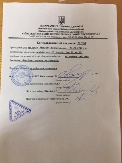 "Учитывая высказывания директора НАБУ Артема Сытника о том, что Поляков является психически больным, сегодня утром, как и обещал, я прошел медицинский осмотр у врача-психиатра Киевского городского психоневрологического диспансера №3. Согласно консультативному заключению (копия прилагается) психических расстройств обнаружено не было", - написал М.Поляков на своей странице в Facebook в понедельник.