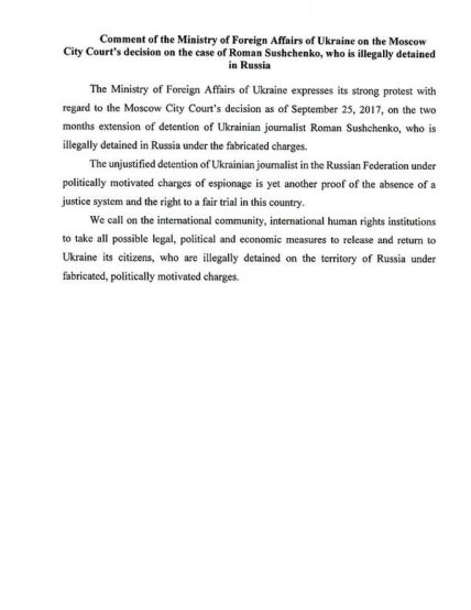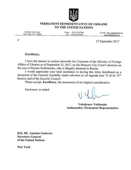 "Настоящим имею честь распространить комментарий Министерства иностранных дел Украины от 25 сентября 2017 года решение Московского городского суда по делу Романа Сущенко, незаконно задержанного в России", - отмечается в официальном письме за подписью главы Миссии Украины при ООН Владимира Ельченко.