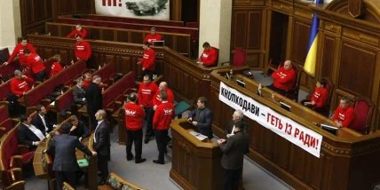 Как сообщает корреспондент УКРИНФОРМа, избранники от фракции "УДАР" блокируют президиум, а представители от "Батькивщины" и "Свободы" – трибуну. Это уже четвертый день, когда парламент Украины не работает.