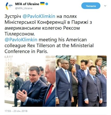 Во вторник, 23 января, министр иностранных дел Украины Павел Климкин в Париже провел встречу с государственным секретарем США Рексом Тиллерсоном.