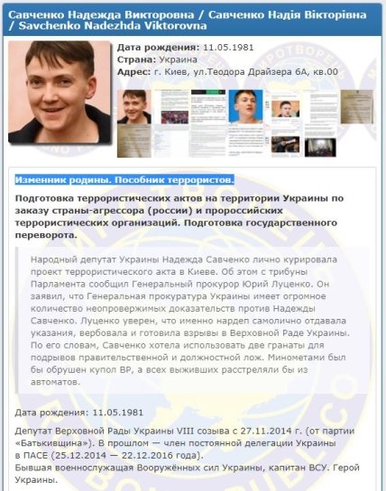 Народного депутата Украины Надежду Савченко внесли в базу сайта "Миротворец". Информация о ней размещена в разделе "Чистилище".