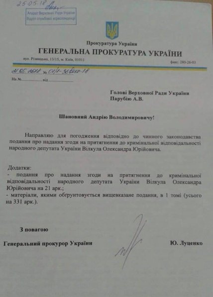 Генеральный прокурор Украины Юрий Луценко внес в Верховную Раду представление о даче согласия на привлечение к уголовной ответственности народного депутата от фракции "Оппозиционный блок" Александра Вилкула, сообщила пресс-секретарь генпрокурора Лариса Сарган.