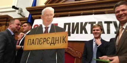 В кулуарах есть несколько депутатов, преимущественно от партии "УДАР". При этом в сессионный зал нардеп от партии "УДАР" Вячеслав Угловой занес картонку, на которой изображен Премьер Николая Азарова и присутствует надпись "папередник".