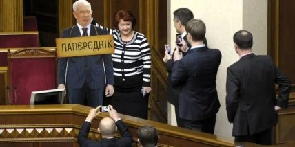 Как сообщалось, сегодня, 5 марта, народные депутаты от оппозиции принесли в сессионный зал Верховной Рады Украины картонную фигуру с изображением Премьер-министра Украины Николая Азарова. На ней было написано “Папередник”.