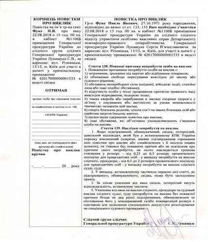 Согласно повестке, П.Фукс (1971 года рождения) должен явиться 22 августа 2018 года в 15:00 в Генеральную прокуратуру Украины к следователю департамента международно-правового сотрудничества Генпрокуратуры на ул.Резницкая,13/15 для участия в допросе в уголовном производстве № 42017000000001533 в качестве свидетеля.