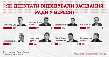 В то же время в КИУ рассказали, что самые высокие показатели у Радикальной партии Олега Ляшко и Блока Петра Порошенко, и в среднем на заседаниях отсутствовали 12% депутатов РПЛ, 14% – БПП, 16% – "Народного фронта", 18% – "Батькивщины" и 22% – "Самопомочи".