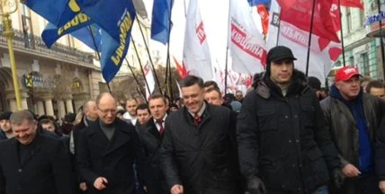 Впереди колоны шли барабанщики, далее молодые люди несли большой Государственный флаг, затем – лидеры парламентских фракций "Батькивщина" Арсений Яценюк, "УДАР" Виталий Кличко и "Свобода" Олег Тягнибок.