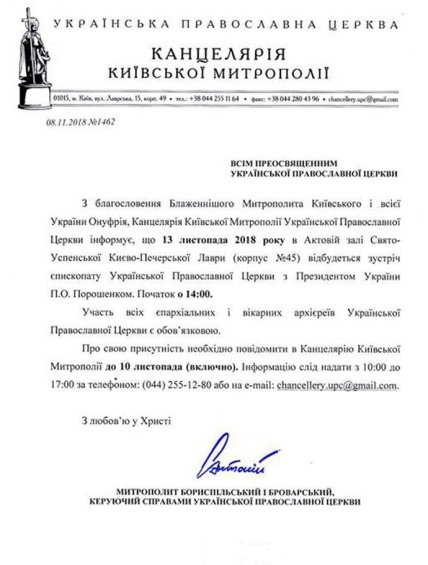 Митрополит УПЦ МП Александр (Драбинко) подтвердил, что встреча епископов УПЦ МП и президента Украины Петра Порошенко запланирована на 13 ноября.