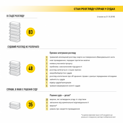 Из 166 уголовных производств, в которых по состоянию на конец октября 2018 года детективы НАБУ завершили досудебное расследование, а прокуроры САП направили обвинительные акты в суд, по 48 делам даже не состоялось подготовительное заседание. Об этом сообщает пресс-служба Национального антикоррупционного бюро Украины.