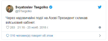 Президент Украины Петр Порошенко созывает Военный кабинет в связи с обстрелом украинских кораблей ВМС Украины российскими пограничниками.