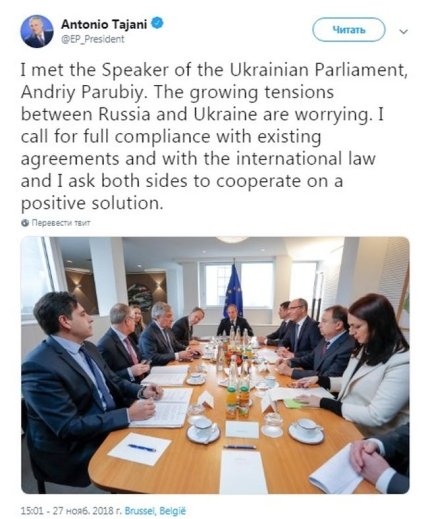 "Растущее напряжение между Россией и Украиной вызывает беспокойство. Я призываю к полному соблюдению существующих соглашений. Учитывая международное право, я прошу обе стороны сотрудничать для поиска положительного решения (конфликта в Керченском проливе - ред.)", - написал Таяни.