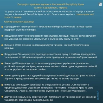 Первые две были приняты Генассамблеей 2016-го и 2017-го года. В этом году документ содержит целый ряд новых статей. Например, четко определяется, как правильно сейчас называть Крым во всех документах ООН.В резолюции вспомнили об украинских политзаключенных Олеге Сенцове и Владимире Балухе.