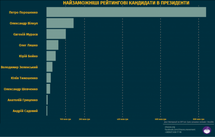 Действующий президент Петр Порошенко по итогам 2017 года задекларировал около 839 млн грн активов и доходов, которые держит в «Международном инвестиционном банке». Александр Вилкул из «Оппозиционного блока» занимает вторую строчку с около 150 млн грн. Лидер партии «Наши» Евгений Мураев замыкает тройку лидеров со 100 млн грн.