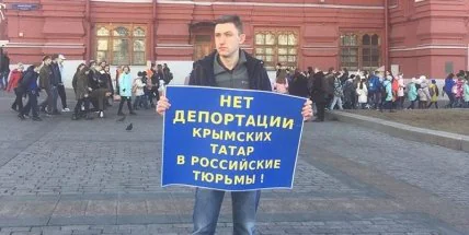 Активист вышел на площадь с плакатом "Нет депортации крымских татар в российские тюрьмы".