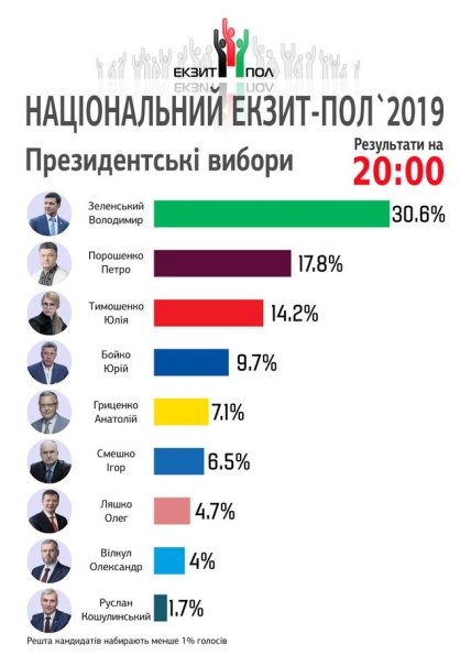 Шоумен Владимир Зеленский лидирует в первом туре голосования на выборах президента Украины с 30,6%, действующий глава государства Петр Порошенко набирает 17,8%, лидер ВО "Батькивщина" Юлия Тимошенко – 14,2%, свидетельствуют данные Национального экзит-пола по состоянию на 20:00.