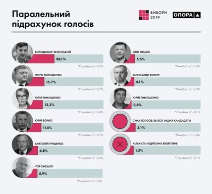- Шоумен Владимир Зеленский - 30.26% голосов избирателей;
