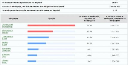 Кандидаты в президенты Украины Владимир Зеленский, Юлия Тимошенко (лидер ВО "Батькивщина") и Петр Порошенко (действующий глава государства) набирают 28,51%, 18,03% и 16,94% голосов избирателей соответственно, сообщает Центральная избирательная комиссия по итогам обработки 0,54% протоколов.