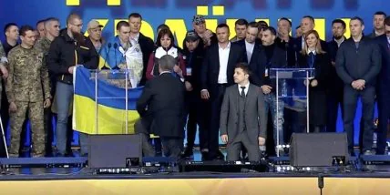 Кандидаты в президенты Украины, действующий глава государства Петр Порошенко и шоумен Владимир Зеленский по призыву последнего встали на колени в знак уважения к родственникам погибших на Донбассе.