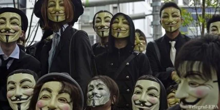 Молодые люди в масках Гая Фокса (маска также известна как маска Анонимуса или Маска V - один из ключевых символов протеста и борьбы против действий власти на Западе, негативных с точки зрения народа) пришли под стены офиса Партии регионов.