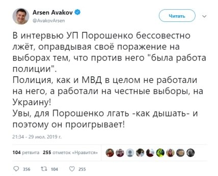 В свою очередь Аваков написал в Твиттере: "В интервью УП Порошенко бессовестно лжёт, оправдывая своё поражение на выборах тем, что против него "была работа полиции".