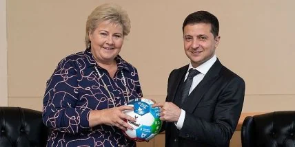 Зеленский сообщил премьер-министру Норвегии о ситуации в Донбассе. В конце встречи Солберг подарила президенту Украины футбольный мяч, на котором изображены Цели устойчивого развития.