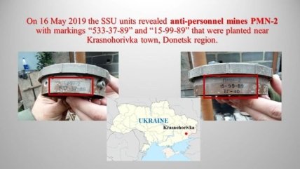 В частности, был приведен пример использования противопехотной мины направленного действия МОН-50, которая была обнаружена 21 марта 2016 г. в районе г.Попасная в Луганской области. Как свидетельствует маркировка, мина была произведена в 2003 году на заводе "Полимер" в г.Чапаевск Самарской области РФ.