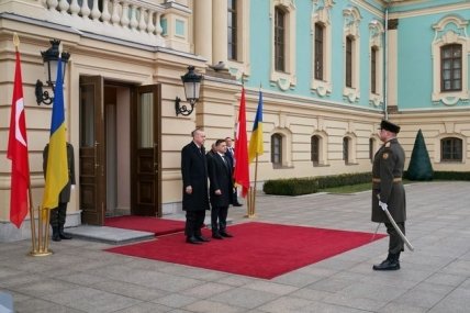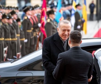 В понедельник, 3 февраля Президент Украины Владимир Зеленский встретил президента Турции Реджепа Эрдогана в Киеве перед Мариинским дворцом. Лидеры государств прошлись вместе перед почетной стражей, и Эрдоган громко сказал к ним "Слава Украине!". Те ответили "Героям Слава!".