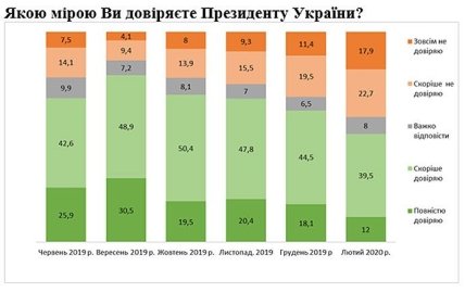 В феврале 2020 года президенту Зеленскому доверяют 51,5%, не доверяют – 41%. Социологи отмечают, что уровень доверия к Зеленскому был самым высоким в сентябре 2019 года – тогда ему доверяли 79% граждан, не доверяли – только 13,5%.