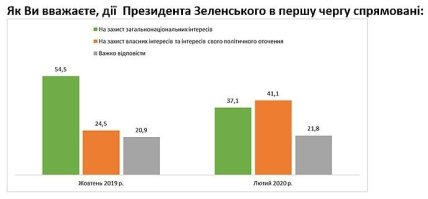 Также в феврале значительно снизилась доля тех, кто считает, что действия Зеленского в первую очередь направлены на защиту общенациональных интересов (37% против 54,5% в сентябре 2019 года), и значительно возросло количество украинцев, которые считают, что действия президента направлены на защиту собственных интересов и интересов своего политического окружения (41% против 24,5% в сентябре).