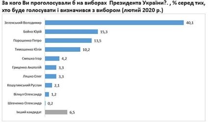 "Если бы в ближайшее время проходили президентские выборы, больше всего голосов получил бы Владимир Зеленский (40% среди тех, кто примет участие в выборах и кто определился, за кого голосовать)", - говорится в сообщении.