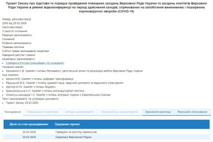 В Верховной Раде Украины зарегистрирован проект закона об основаниях и порядке проведения пленарных заседаний парламента и заседаний его комитетов в режиме видеоконференции на период осуществления мероприятий, направленных на предотвращение возникновения и распространения коронавирусной болезни (№3250).