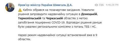 "Кабмин собрался на внеочередное заседание. Приняли решение ввести чрезвычайную ситуацию в Донецкой, Тернопольской и Черкасской областях с целью предотвращения распространения COVID-19", - написал Шмыгаль своем Телеграм-канале.