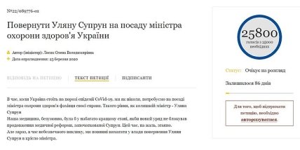Электронная петиция о восстановлении Ульяны Супрун на посту главы Министерства здравоохранения набрала необходимое для рассмотрения количество голосов – 25 тыс