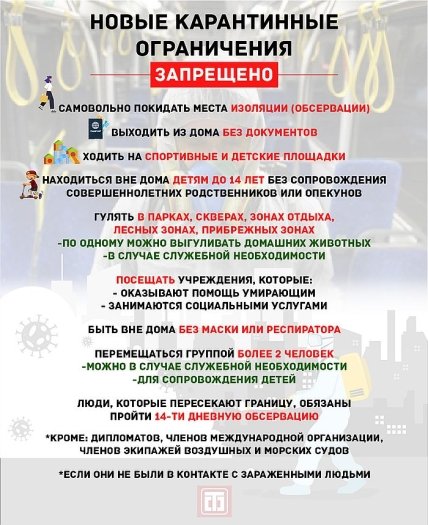 2 апреля Кабинет министров ввел более жесткие ограничения на время карантина, который будет действовать до 24 апреля минимум. В частности, с 6 апреля запрещается находиться в общественных местах без надетой маски или респиратора, а также ходить больше, чем по двое (за исключением сопровождения детей".