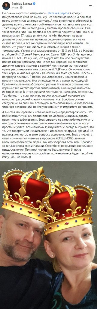Что касается лечения, то Береза консультировался с украинскими и израильскими врачами. Выяснилось, что протоколы лечения коронавируса абсолютно разные. Украинские специалисты сразу же выписали супругам антибиотики, а их израильские коллеги категорически против такого лечения.