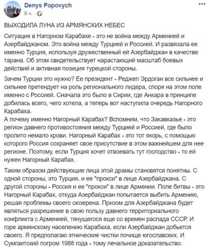 А почему именно Нагорный Карабах? Вспомним, что Закавказье - это регион давнего противостояния между Турцией и Россией, где было пролито немало крови. Нагорный Карабах - это тот якорь, с помощью которого Россия сохраняет свое присутствие в этом важнейшем для нее регионе. Поэтому, если Турция хочет отвоевать тут господство - то ей нужен Нагорный Карабах", - пишет журналист на своей странице в Facebook.