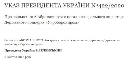 Президент Владимир Зеленский уволил Айвараса Абромавичуса с должности генерального директора Укроборонпрома (Абромавичус возглавлял концерн с 30 августа 2019 года. - Авт.). Соответствующий указ появился на сайте президента 6 октября.