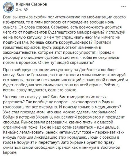 "По ощущениям, это выступление прибавит к рейтингу СН в областях минимум до 5%", - пишет он.
