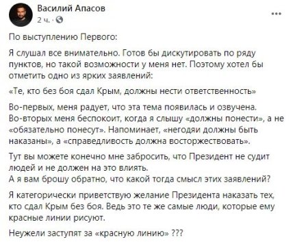 К обсуждению выступления главы государства также присоединился журнались Василий Апасов. Он отреагировал на заявление Зеленского: "Те, кто без боя сдал Крым, должны нести ответственность".