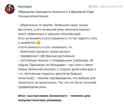 Выступление Зеленского - типично для популистических режимов.