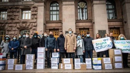 Киевляне собрались на акцию под КГГА, чтобы напомнить мэру Киева Виталию Кличко о невыполненных обещаниях и вручить ему коробки с собранными в поддержку петиции подписями. Таких насчитали более 100 тысяч. Акцию поддержала политическая сила «Победа Пальчевского».