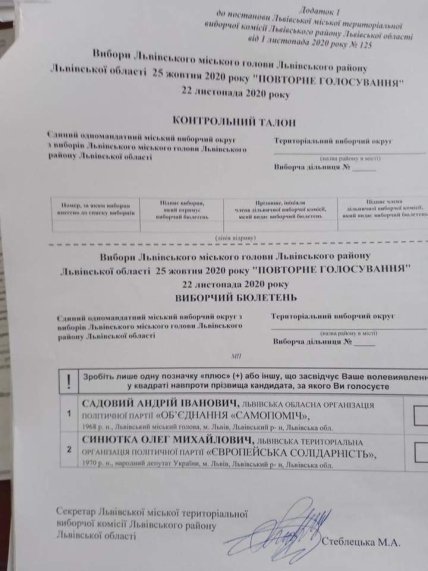 Согласно окончательным результатам первого тура, Садовый получил 40,09% голосов, в то время, как Синютка - 31,1%.