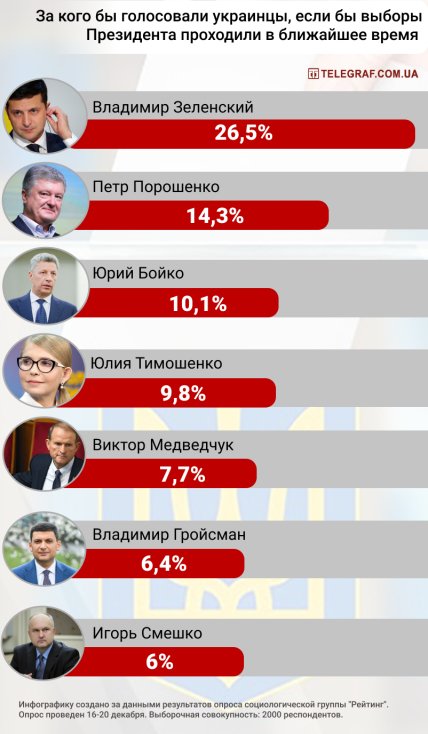 В свою очередь, за Петра Порошенко проголосовали бы 14,3%, Юрия Бойко - 10,1%, Юлию Тимошенко - 9,8%. Виктора Медведчука - 7,7%, Владимира Гройсмана - 6,4%, Игоря Смешко - 6,0%, Дмитрия Разумкова - 4,1%, Олега Ляшко - 3,6%.