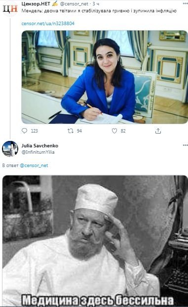 "Помню ... Мне удалось дать два этих твитов очень быстро ... Помню ..." - вы прослушали краткий курс экономики и финансов от Мендель", "Двумя твитами Юлия Мендель стабилизировала температуру Кернеса до комнатной", "Алло, Галя! Ты сейчас упадешь !! Я двумя твитами стабилизировала гривну и остановила инфляцию", "Не все герои носят плащи ...", "Советский рубль был обеспечен Золотым Запасом СССР. Украинская гривна обеспечена твитами Мендель", "И реформ не надо!", - пишут пользователи Twitter.