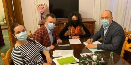 "Премьер-министр Денис Шмыгаль, заместитель министра экономики Светлана Панаиотиди, советник премьер-министра Наталья Бойко. В кабинете у заместителя руководителя офиса Юлии Свириденко. Юлия где-то на другом совещании, а цветы за нашей спиной - это поздравление Юлии Свириденко с днем рождения, как сегодня она проводит на работе", - написал он.