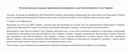 "Решение об увольнении судьи Конституционного Суда Украины с должности принимается исключительно Конституционным Судом Украины на специальном пленарном заседании, и никакой другой орган или должностное лицо не могут принять такое решение вместо него", - отреагировали на увольнение Тупицкого на официальном сайте Конституционного суда Украины.