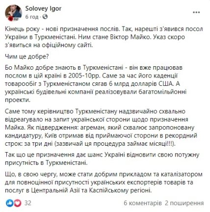 По информации руководителя "Агентства международных исследований" Игоря Соловья, туркменская сторона в рекордные сроки одобрила кандидатуру Майко. Агреман был подписан всего за три дня, хотя обычно эта процедура занимает около месяца.